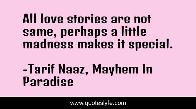 This page presents the quote "All love stories are not same, perhaps a little madness makes it special.". Author of this quote is Tarif Naaz, Mayhem In Paradise. This quote is about love, madness, affection,.