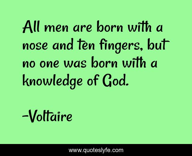 This page presents the quote "All men are born with a nose and ten fingers, but no one was born with a knowledge of God.". Author of this quote is Voltaire. This quote is about atheism, wit, humor,.