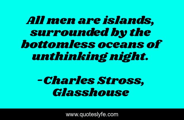 This page presents the quote "All men are islands, surrounded by the bottomless oceans of unthinking night.". Author of this quote is Charles Stross, Glasshouse. .