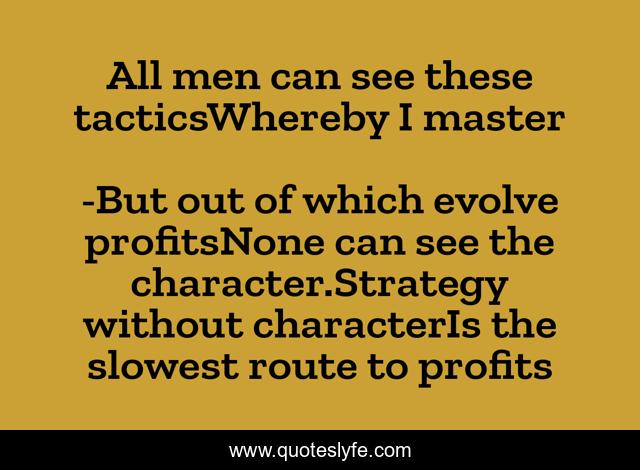 This page presents the quote "All men can see these tacticsWhereby I master". Author of this quote is But out of which evolve profitsNone can see the character.Strategy without characterIs the slowest route to profits. .