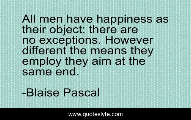 This page presents the quote "All men have happiness as their object: there are no exceptions. However different the means they employ they aim at the same end.". Author of this quote is Blaise Pascal. .