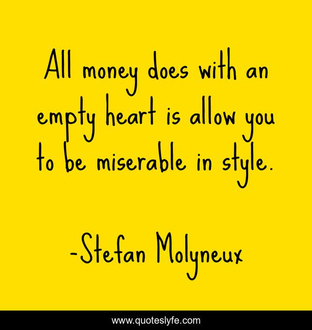 This page presents the quote "All money does with an empty heart is allow you to be miserable in style.". Author of this quote is Stefan Molyneux. This quote is about relationships, growth, happiness, philosophy, self-knowledge,.