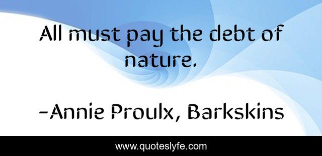 This page presents the quote "All must pay the debt of nature.". Author of this quote is Annie Proulx, Barkskins. This quote is about environment, environmentalism, nature,.