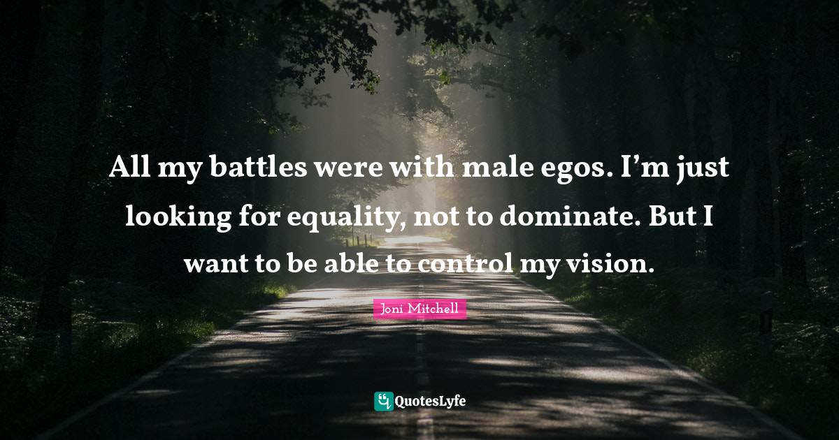 This page presents the quote "All my battles were with male egos. I’m just looking for equality, not to dominate. But I want to be able to control my vision.". Author of this quote is Joni Mitchell. This quote is about vision, able, battle, ego, want, equality,.