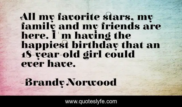 This page presents the quote "All my favorite stars, my family and my friends are here. I'm having the happiest birthday that an 18-year-old girl could ever have.". Author of this quote is Brandy Norwood. This quote is about friends, family, stars,.
