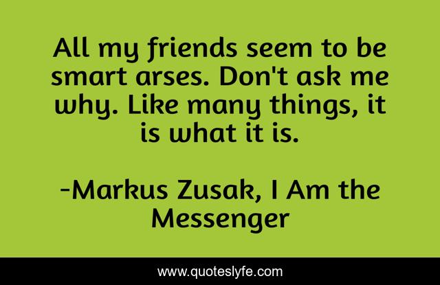 This page presents the quote "All my friends seem to be smart arses. Don't ask me why. Like many things, it is what it is.". Author of this quote is Markus Zusak, I Am the Messenger. This quote is about smartass, friends,.