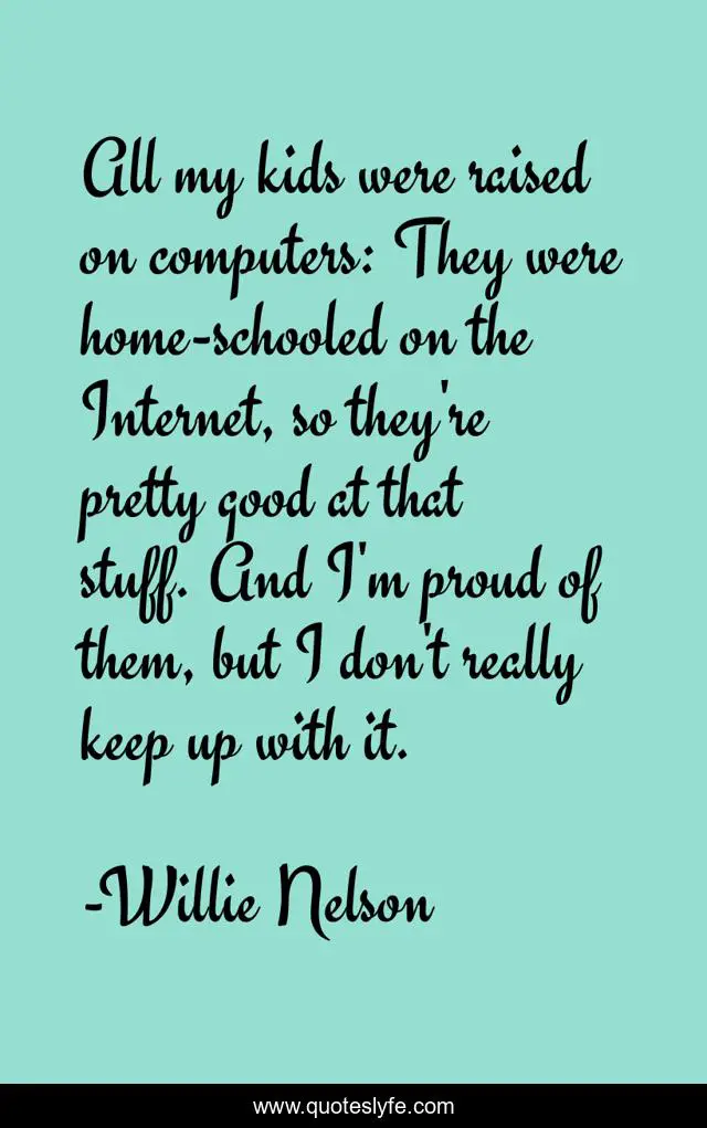 This page presents the quote "All my kids were raised on computers: They were home-schooled on the Internet, so they're pretty good at that stuff. And I'm proud of them, but I don't really keep up with it.". Author of this quote is Willie Nelson. This quote is about good, internet, proud,.