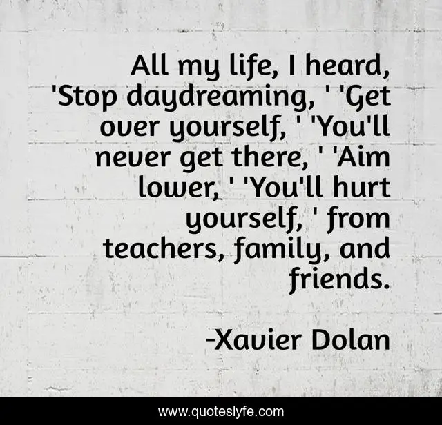 This page presents the quote "All my life, I heard, 'Stop daydreaming, ' 'Get over yourself, ' 'You'll never get there, ' 'Aim lower, ' 'You'll hurt yourself, ' from teachers, family, and friends.". Author of this quote is Xavier Dolan. This quote is about life, friends, yourself,.