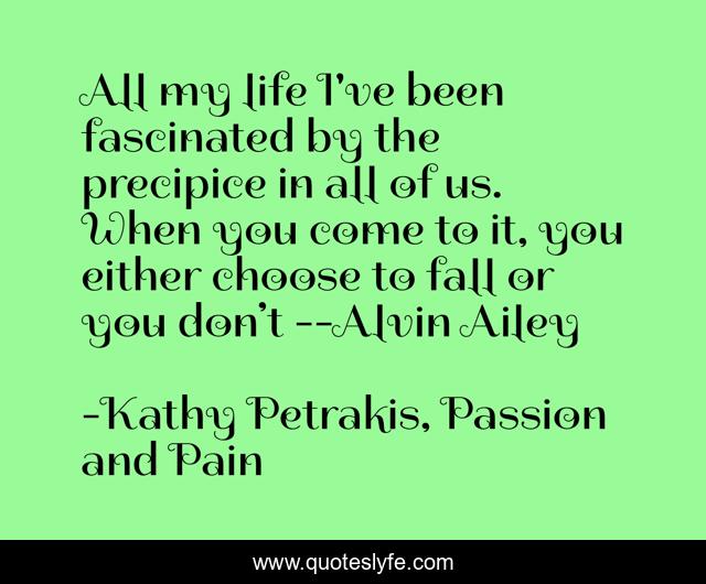 This page presents the quote "All my life I've been fascinated by the precipice in all of us. When you come to it, you either choose to fall or you don’t --Alvin Ailey". Author of this quote is Kathy Petrakis, Passion and Pain. This quote is about dance, positive, confidence, motivational, optimistic,.