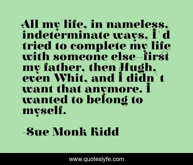This page presents the quote "All my life, in nameless, indeterminate ways, I'd tried to complete my life with someone else--first my father, then Hugh, even Whit, and I didn't want that anymore. I wanted to belong to myself.". Author of this quote is Sue Monk Kidd. This quote is about self-love, marriage-within,.