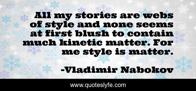 This page presents the quote "All my stories are webs of style and none seems at first blush to contain much kinetic matter. For me style is matter.". Author of this quote is Vladimir Nabokov. This quote is about matter, style, stories,.