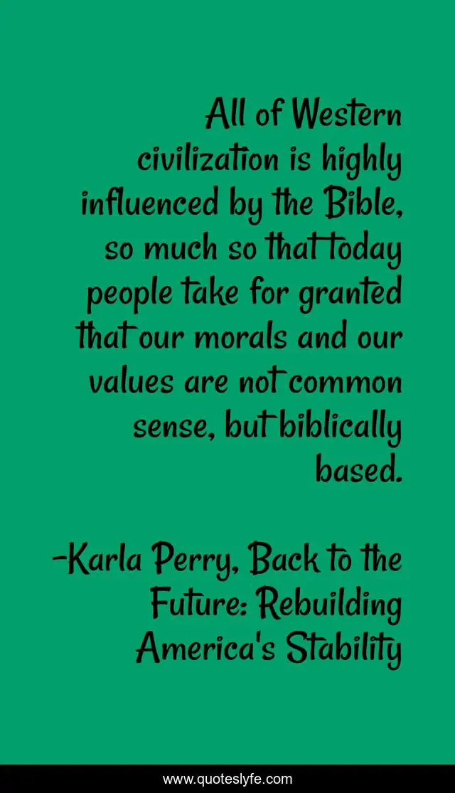 This page presents the quote "All of Western civilization is highly influenced by the Bible, so much so that today people take for granted that our morals and our values are not common sense, but biblically based.". Author of this quote is Karla Perry, Back to the Future: Rebuilding America's Stability. This quote is about western-civilization, bible, values, morals,.