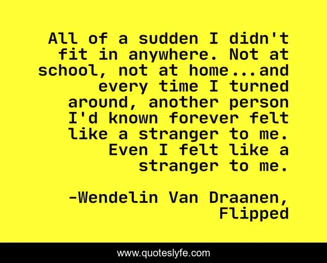 This page presents the quote "All of a sudden I didn't fit in anywhere. Not at school, not at home...and every time I turned around, another person I'd known forever felt like a stranger to me. Even I felt like a stranger to me.". Author of this quote is Wendelin Van Draanen, Flipped. This quote is about alone, all-of-a-sudden, flipped,.