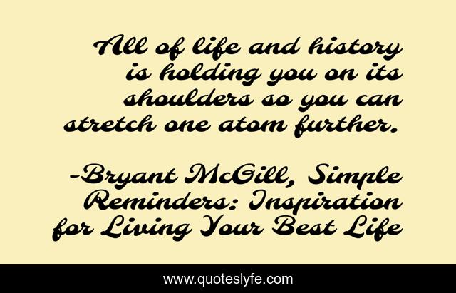 This page presents the quote "All of life and history is holding you on its shoulders so you can stretch one atom further.". Author of this quote is Bryant McGill, Simple Reminders: Inspiration for Living Your Best Life. This quote is about teaching, life, growth, history,.
