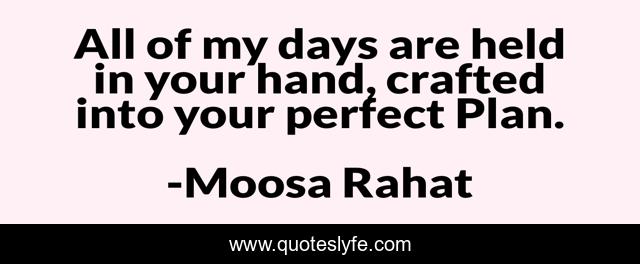 This page presents the quote "All of my days are held in your hand, crafted into your perfect Plan.". Author of this quote is Moosa Rahat. This quote is about faith, hopeful, optimistic, god,.