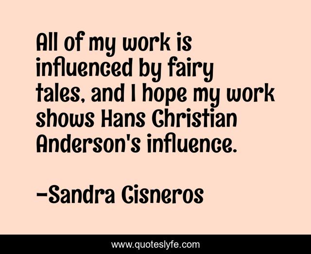 This page presents the quote "All of my work is influenced by fairy tales, and I hope my work shows Hans Christian Anderson's influence.". Author of this quote is Sandra Cisneros. This quote is about influence, work, christian,.