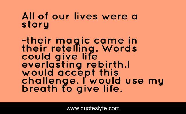 "their magic came in their retelling. Words could give life everlasting rebirth.I would accept this challenge. I would use my breath to give life. Quotes." Quoteslyfe.com, 2025. Sat. 06 Dec. 2025. <https://www.quoteslyfe.com/quote/All-of-our-lives-were-a-story-200032>.