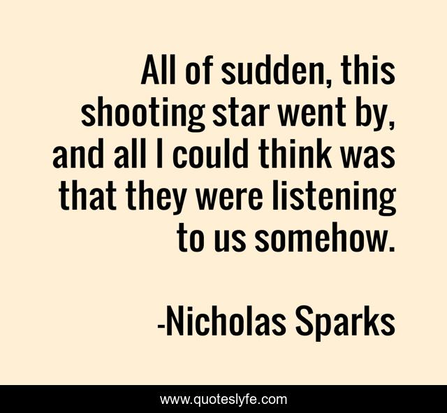 This page presents the quote "All of sudden, this shooting star went by, and all I could think was that they were listening to us somehow.". Author of this quote is Nicholas Sparks. This quote is about love, hope, affection,.