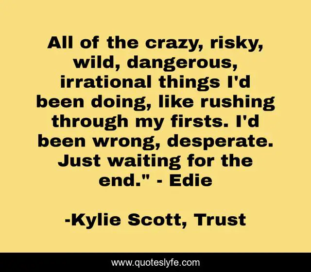 This page presents the quote "All of the crazy, risky, wild, dangerous, irrational things I'd been doing, like rushing through my firsts. I'd been wrong, desperate. Just waiting for the end." - Edie". Author of this quote is Kylie Scott, Trust. This quote is about coming-of-age, love, affection,.