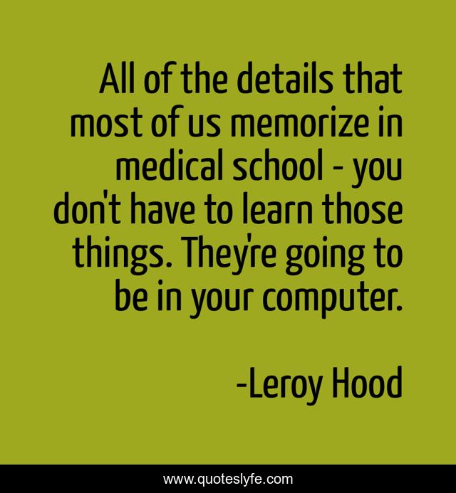 This page presents the quote "All of the details that most of us memorize in medical school - you don't have to learn those things. They're going to be in your computer.". Author of this quote is Leroy Hood. This quote is about school, details,.