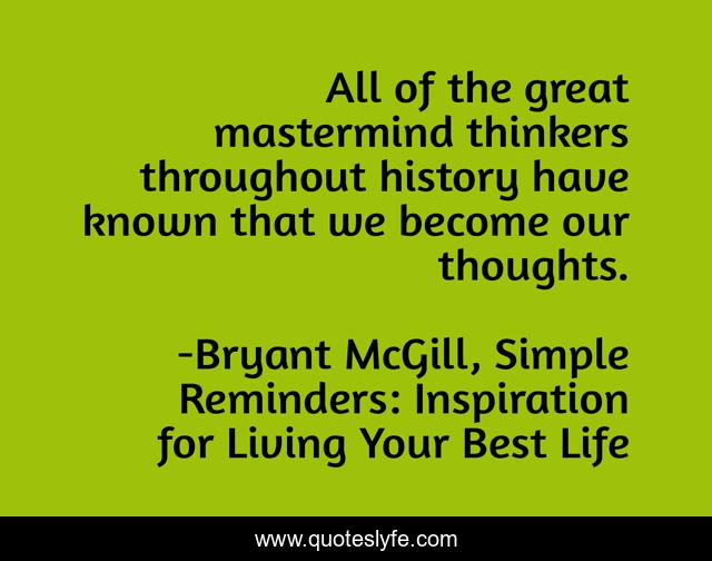 This page presents the quote "All of the great mastermind thinkers throughout history have known that we become our thoughts.". Author of this quote is Bryant McGill, Simple Reminders: Inspiration for Living Your Best Life. This quote is about mastery, thinking, becoming, history,.