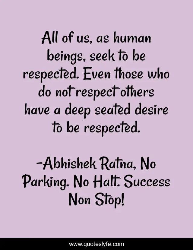 This page presents the quote "All of us, as human beings, seek to be respected. Even those who do not respect others have a deep seated desire to be respected.". Author of this quote is Abhishek Ratna, No Parking. No Halt. Success Non Stop!. This quote is about respecting, respect, respecting-others, success,.