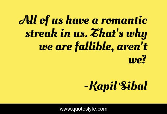This page presents the quote "All of us have a romantic streak in us. That's why we are fallible, aren't we?". Author of this quote is Kapil Sibal. This quote is about fallible, why, us,.