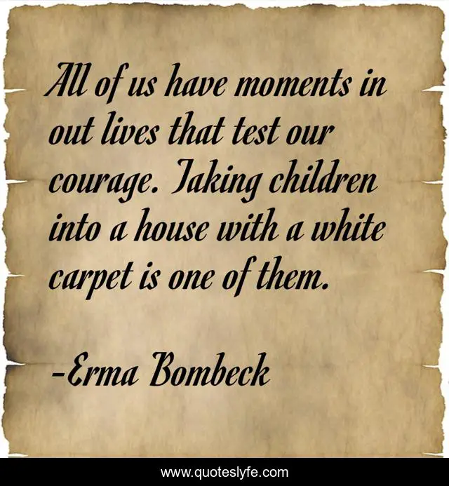 This page presents the quote "All of us have moments in out lives that test our courage. Taking children into a house with a white carpet is one of them.". Author of this quote is Erma Bombeck. This quote is about housekeeping, parenthood, parenting, courage, carpeting, children, bravery,.