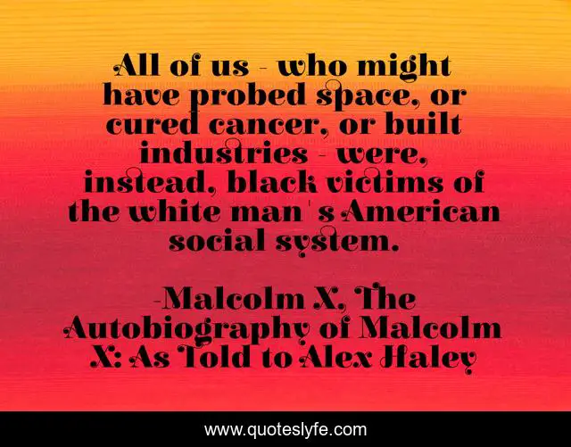 This page presents the quote "All of us - who might have probed space, or cured cancer, or built industries - were, instead, black victims of the white man's American social system.". Author of this quote is Malcolm X, The Autobiography of Malcolm X: As Told to Alex Haley. This quote is about cancer, space, industry, systemic-racism, society, potential,.