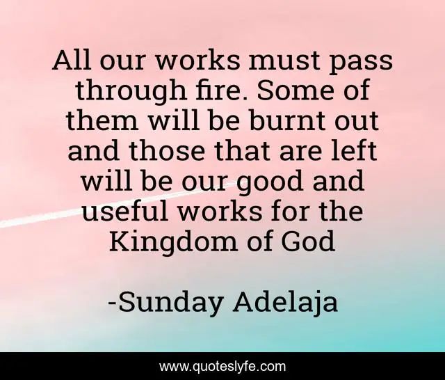 This page presents the quote "All our works must pass through fire. Some of them will be burnt out and those that are left will be our good and useful works for the Kingdom of God". Author of this quote is Sunday Adelaja. This quote is about kingdom, god, fulfillment, works, evaluation, purpose,.