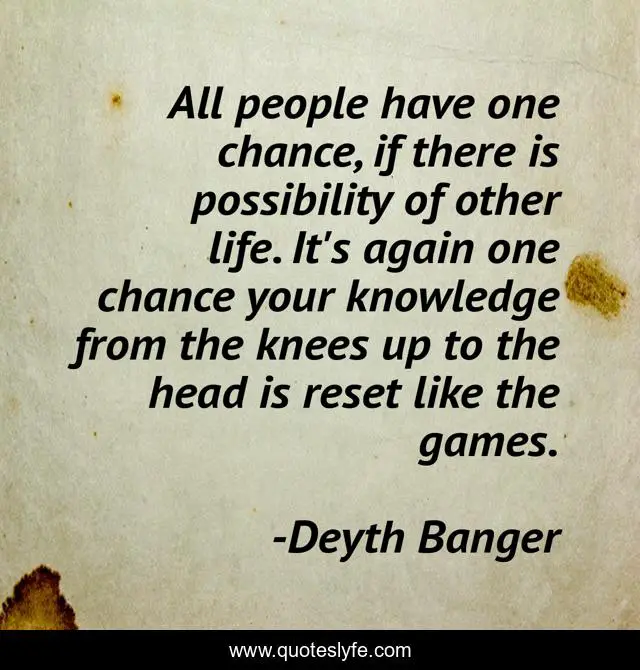 This page presents the quote "All people have one chance, if there is possibility of other life. It's again one chance your knowledge from the knees up to the head is reset like the games.". Author of this quote is Deyth Banger. This quote is about life, game, possibility, one, chance, games,.