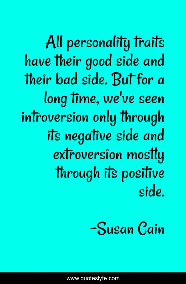 This page presents the quote "All personality traits have their good side and their bad side. But for a long time, we've seen introversion only through its negative side and extroversion mostly through its positive side.". Author of this quote is Susan Cain. This quote is about good, time, personality,.