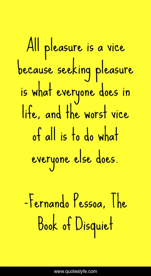 "Fernando Pessoa, The Book of Disquiet Quotes." Quoteslyfe.com, 2025. Mon. 08 Dec. 2025. <https://www.quoteslyfe.com/quote/All-pleasure-is-a-vice-because-seeking-227156>.