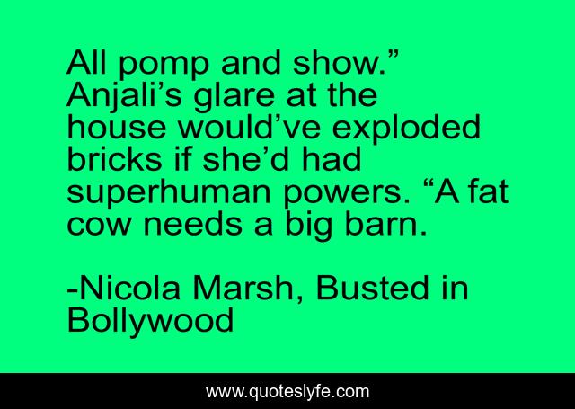 This page presents the quote "All pomp and show.” Anjali’s glare at the house would’ve exploded bricks if she’d had superhuman powers. “A fat cow needs a big barn.". Author of this quote is Nicola Marsh, Busted in Bollywood. This quote is about romance-funny, humor, india, contemporary-romance, romance-novels,.