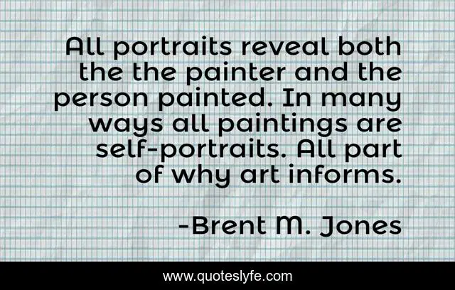 This page presents the quote "All portraits reveal both the the painter and the person painted. In many ways all paintings are self-portraits. All part of why art informs.". Author of this quote is Brent M. Jones. This quote is about artistry, self-portrait, art, portraits, photography, contemporary-art,.