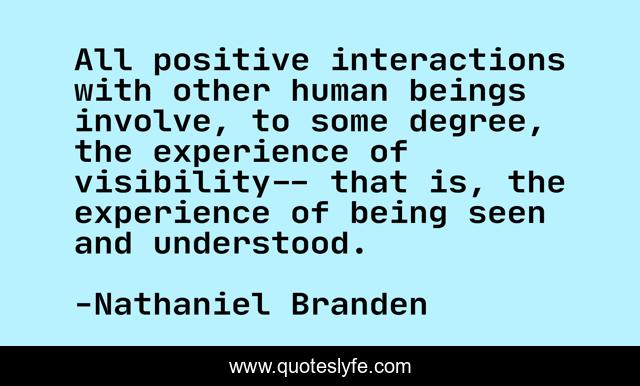 This page presents the quote "All positive interactions with other human beings involve, to some degree, the experience of visibility-- that is, the experience of being seen and understood.". Author of this quote is Nathaniel Branden. This quote is about relationships, psychology, self-knowledge, healthy, friendship, self-esteem,.