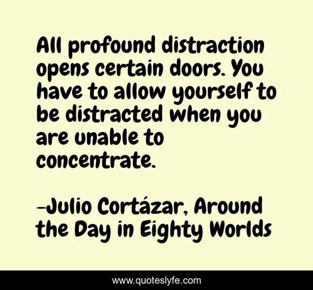 This page presents the quote "All profound distraction opens certain doors. You have to allow yourself to be distracted when you are unable to concentrate.". Author of this quote is Julio Cortázar, Around the Day in Eighty Worlds. This quote is about distraction, creativity, writing,.