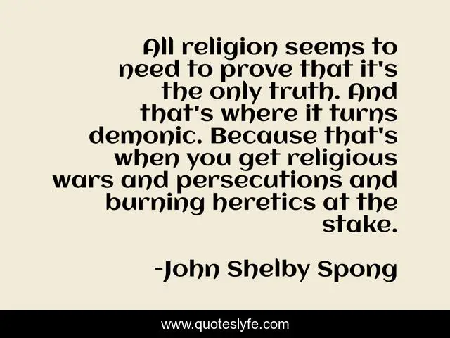 This page presents the quote "All religion seems to need to prove that it's the only truth. And that's where it turns demonic. Because that's when you get religious wars and persecutions and burning heretics at the stake.". Author of this quote is John Shelby Spong. This quote is about need, truth,.