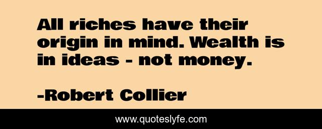 This page presents the quote "All riches have their origin in mind. Wealth is in ideas - not money.". Author of this quote is Robert Collier. This quote is about mind, ideas, wealth,.