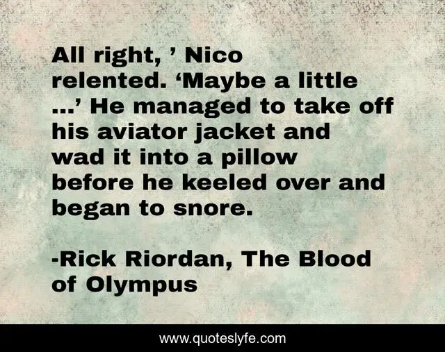 This page presents the quote "All right, ’ Nico relented. ‘Maybe a little …’ He managed to take off his aviator jacket and wad it into a pillow before he keeled over and began to snore.". Author of this quote is Rick Riordan, The Blood of Olympus. This quote is about sleep, rest,.