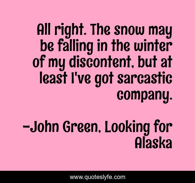 This page presents the quote "All right. The snow may be falling in the winter of my discontent, but at least I've got sarcastic company.". Author of this quote is John Green, Looking for Alaska. .