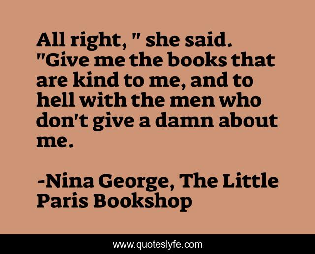 This page presents the quote "All right, " she said. "Give me the books that are kind to me, and to hell with the men who don't give a damn about me.". Author of this quote is Nina George, The Little Paris Bookshop. This quote is about comfort, books-reading,.