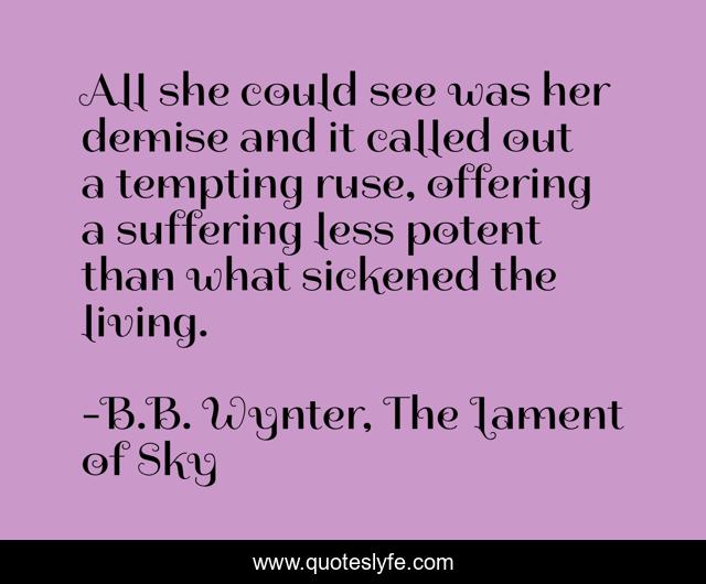 This page presents the quote "All she could see was her demise and it called out a tempting ruse, offering a suffering less potent than what sickened the living.". Author of this quote is B.B. Wynter, The Lament of Sky. This quote is about romance, horror, gothic, dark-fantasy,.