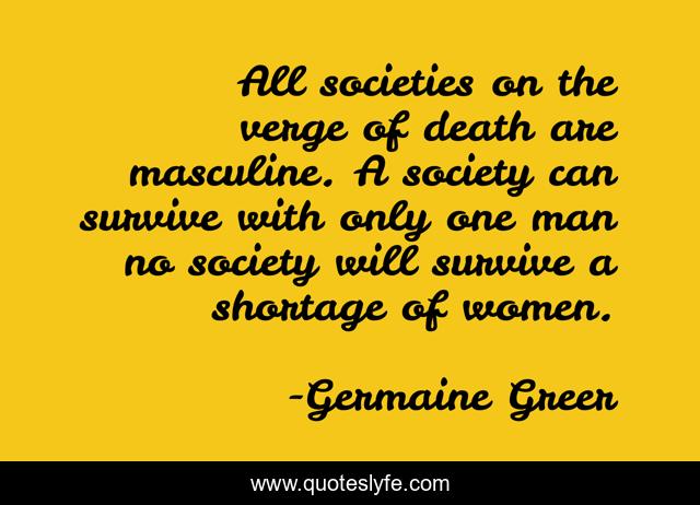 This page presents the quote "All societies on the verge of death are masculine. A society can survive with only one man no society will survive a shortage of women.". Author of this quote is Germaine Greer. This quote is about society, women, man,.