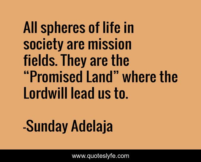 This page presents the quote "All spheres of life in society are mission fields. They are the “Promised Land” where the Lordwill lead us to.". Author of this quote is Sunday Adelaja. This quote is about society, life, mission, sphere,.