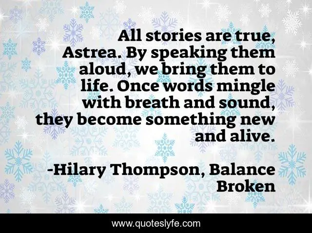 This page presents the quote "All stories are true, Astrea. By speaking them aloud, we bring them to life. Once words mingle with breath and sound, they become something new and alive.". Author of this quote is Hilary Thompson, Balance Broken. .