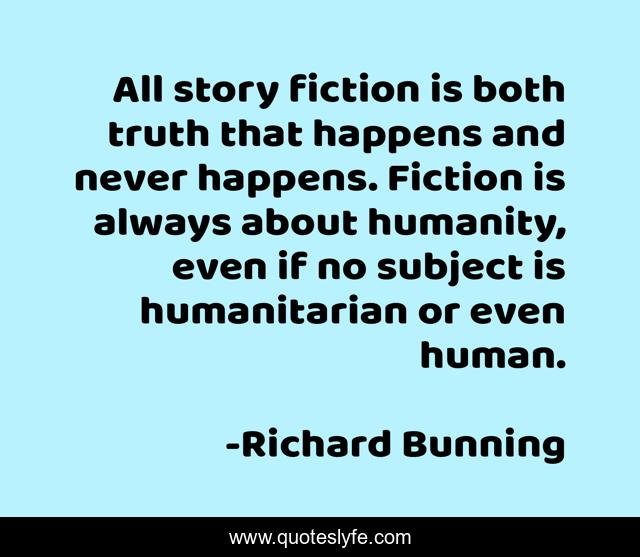 This page presents the quote "All story fiction is both truth that happens and never happens. Fiction is always about humanity, even if no subject is humanitarian or even human.". Author of this quote is Richard Bunning. .