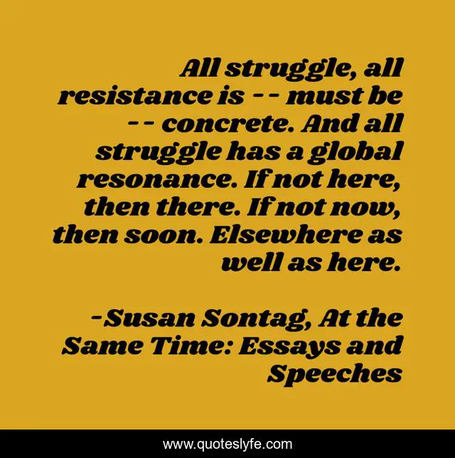 This page presents the quote "All struggle, all resistance is -- must be -- concrete. And all struggle has a global resonance. If not here, then there. If not now, then soon. Elsewhere as well as here.". Author of this quote is Susan Sontag, At the Same Time: Essays and Speeches. This quote is about trial, struggle, community,.