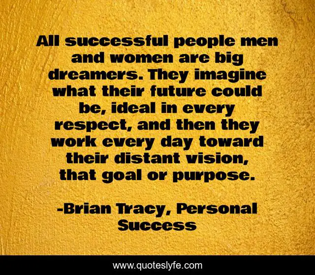 This page presents the quote "All successful people men and women are big dreamers. They imagine what their future could be, ideal in every respect, and then they work every day toward their distant vision, that goal or purpose.". Author of this quote is Brian Tracy, Personal Success. This quote is about dreamers, life, successful-people, planning, wisdom, goal-setting,.