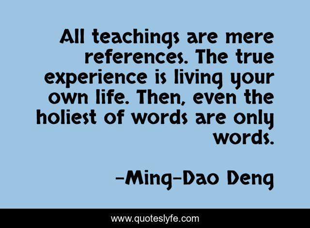 This page presents the quote "All teachings are mere references. The true experience is living your own life. Then, even the holiest of words are only words.". Author of this quote is Ming-Dao Deng. This quote is about living, life, teachings, holy-books, experience, wisdom, religion, alive, teaching,.